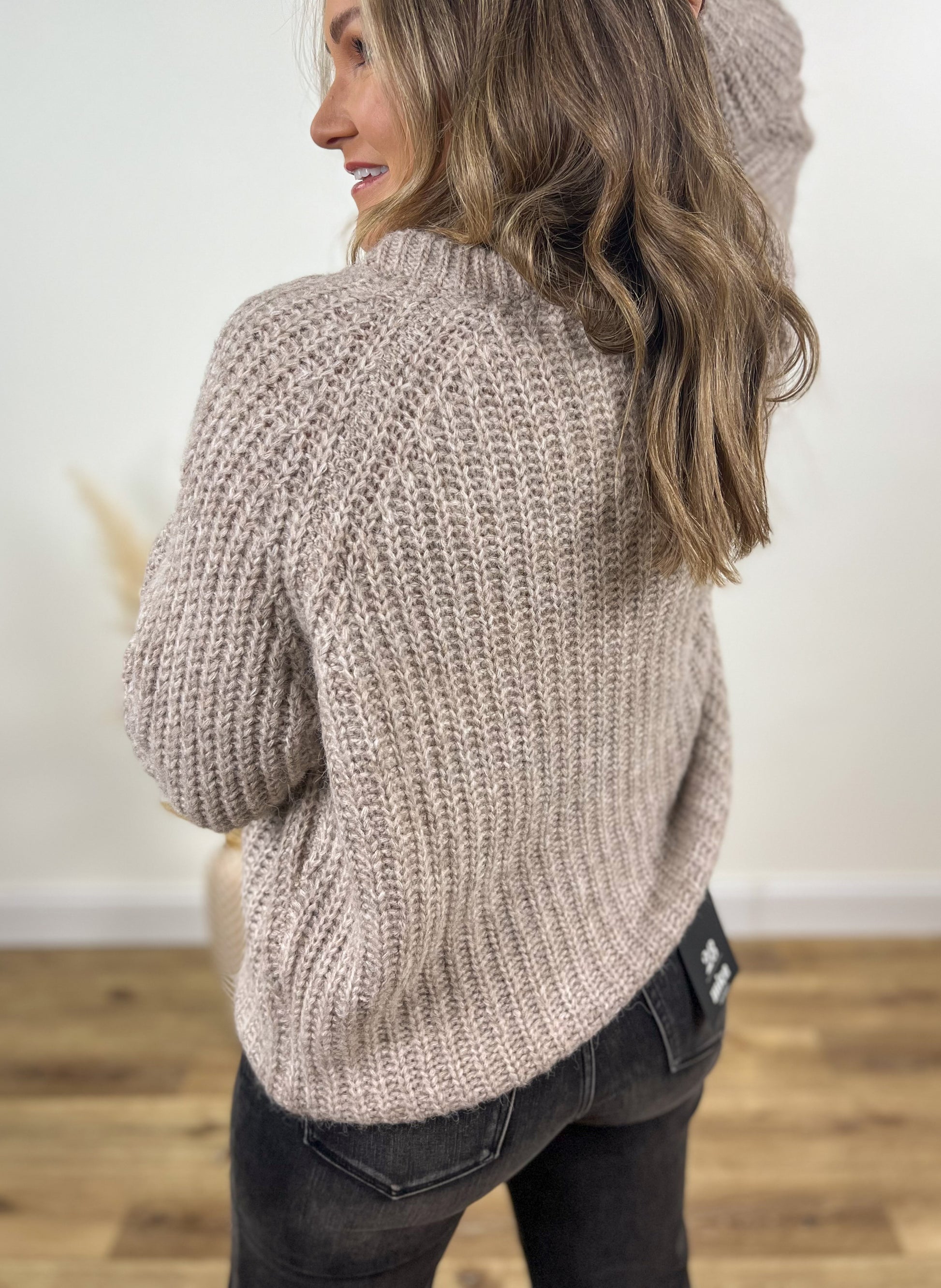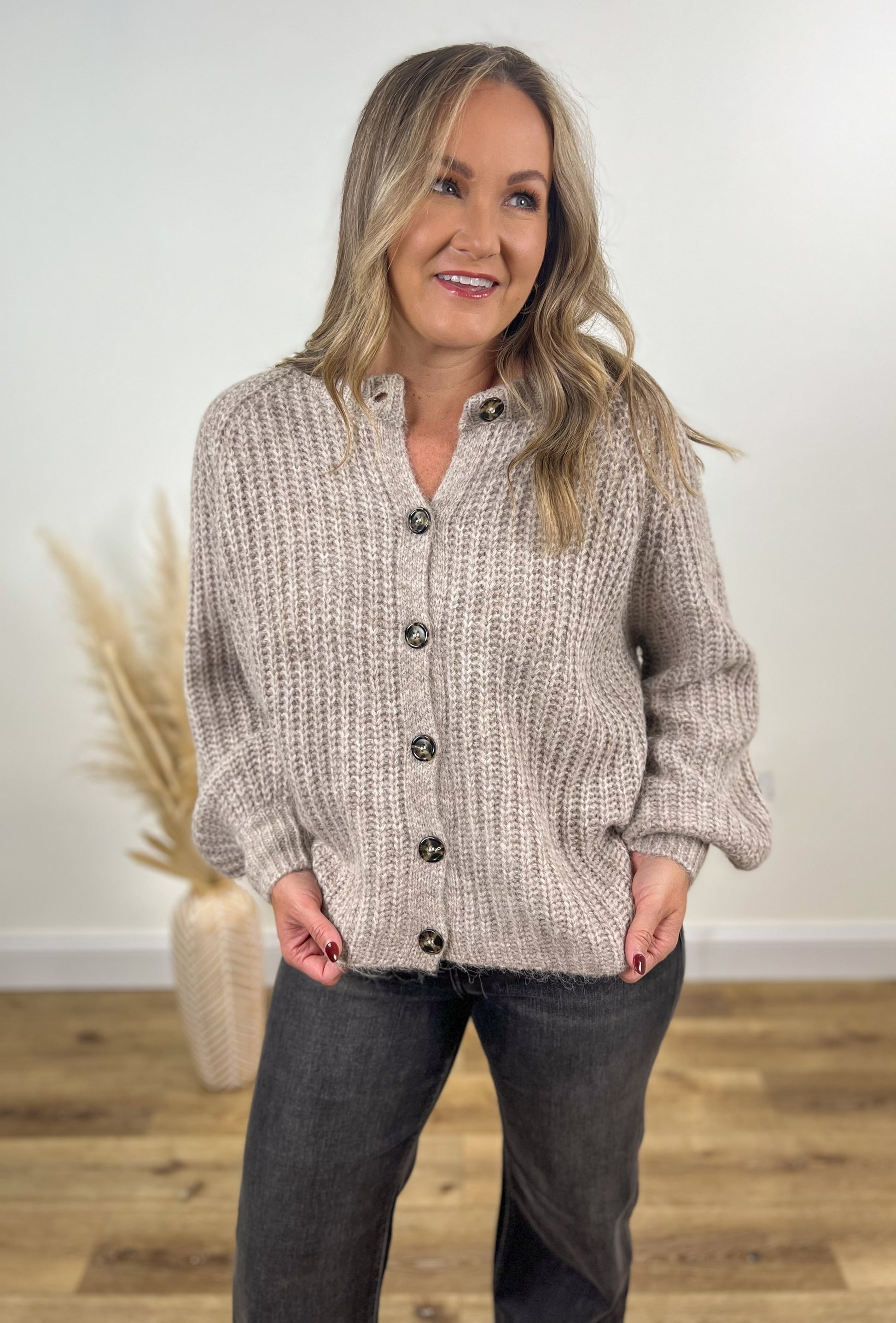 Chunky knit taupe cardigan with button front and a relaxed fit.