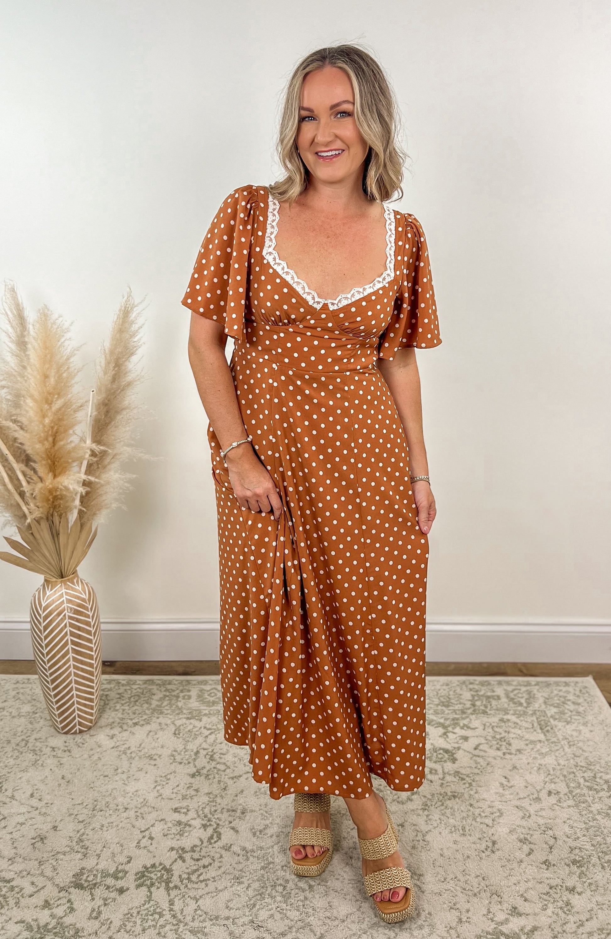 Caramel colored long dress with cream polka dot patter throughout, a sweetheart neckline, and lace trim detail. Features a side zipper closure, tie back, and pockets.