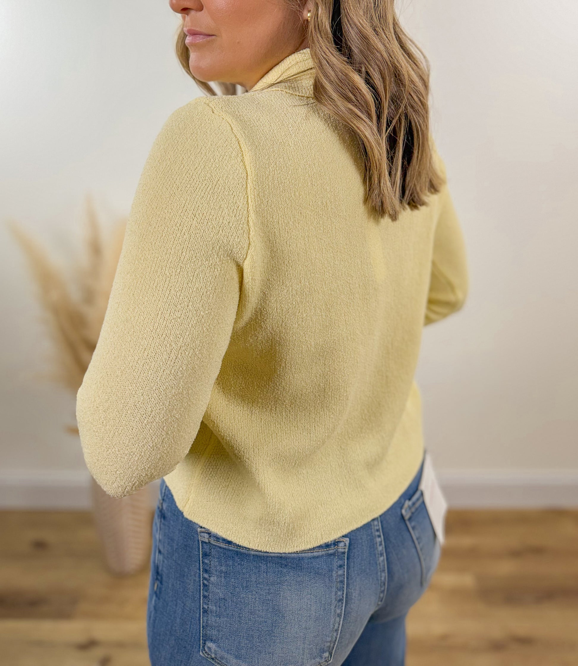 Butter yellow sweater knit button front cardigan with collar.