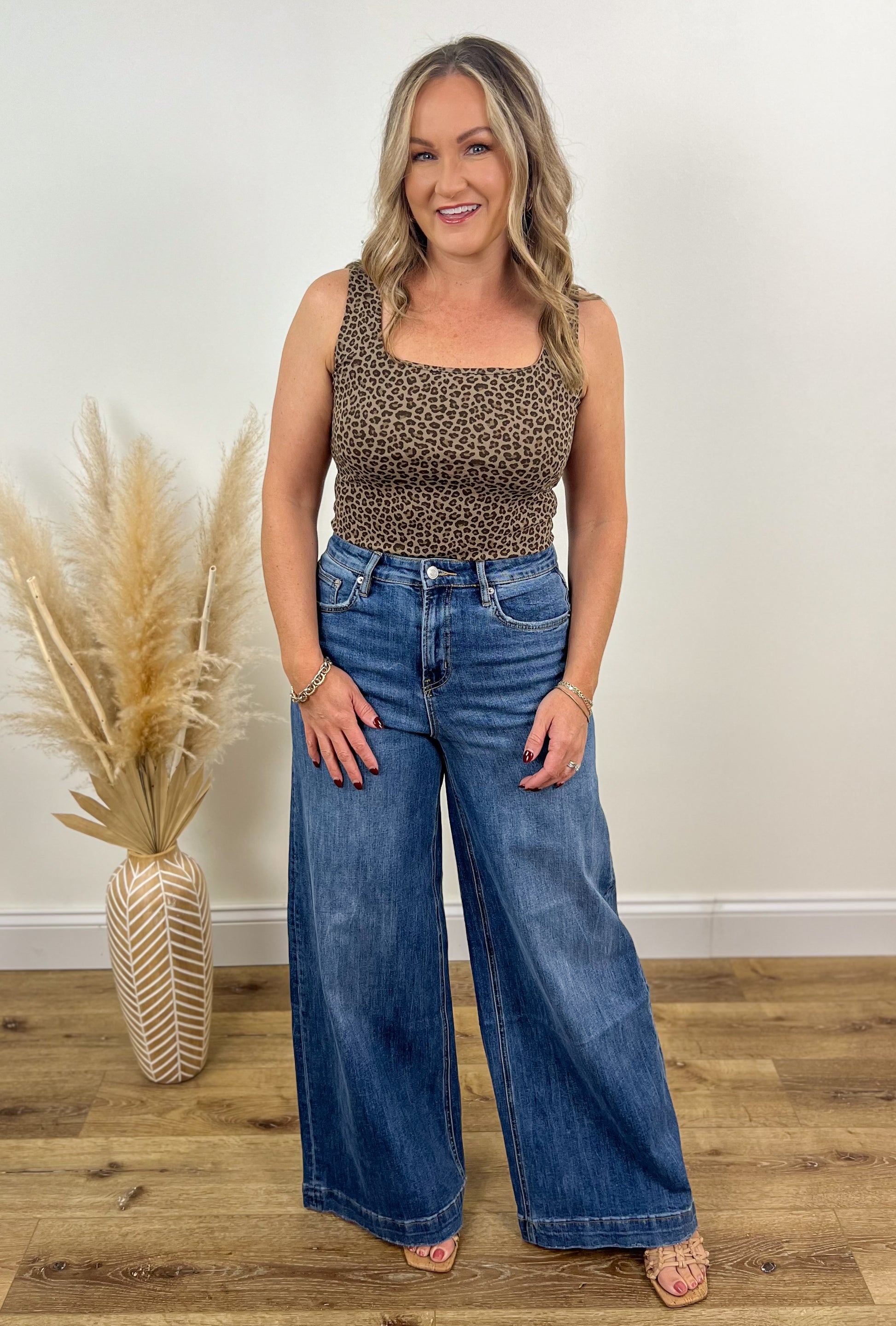 Thick strap leopard print square neck bodysuit. A fun base layer for cool weather season!