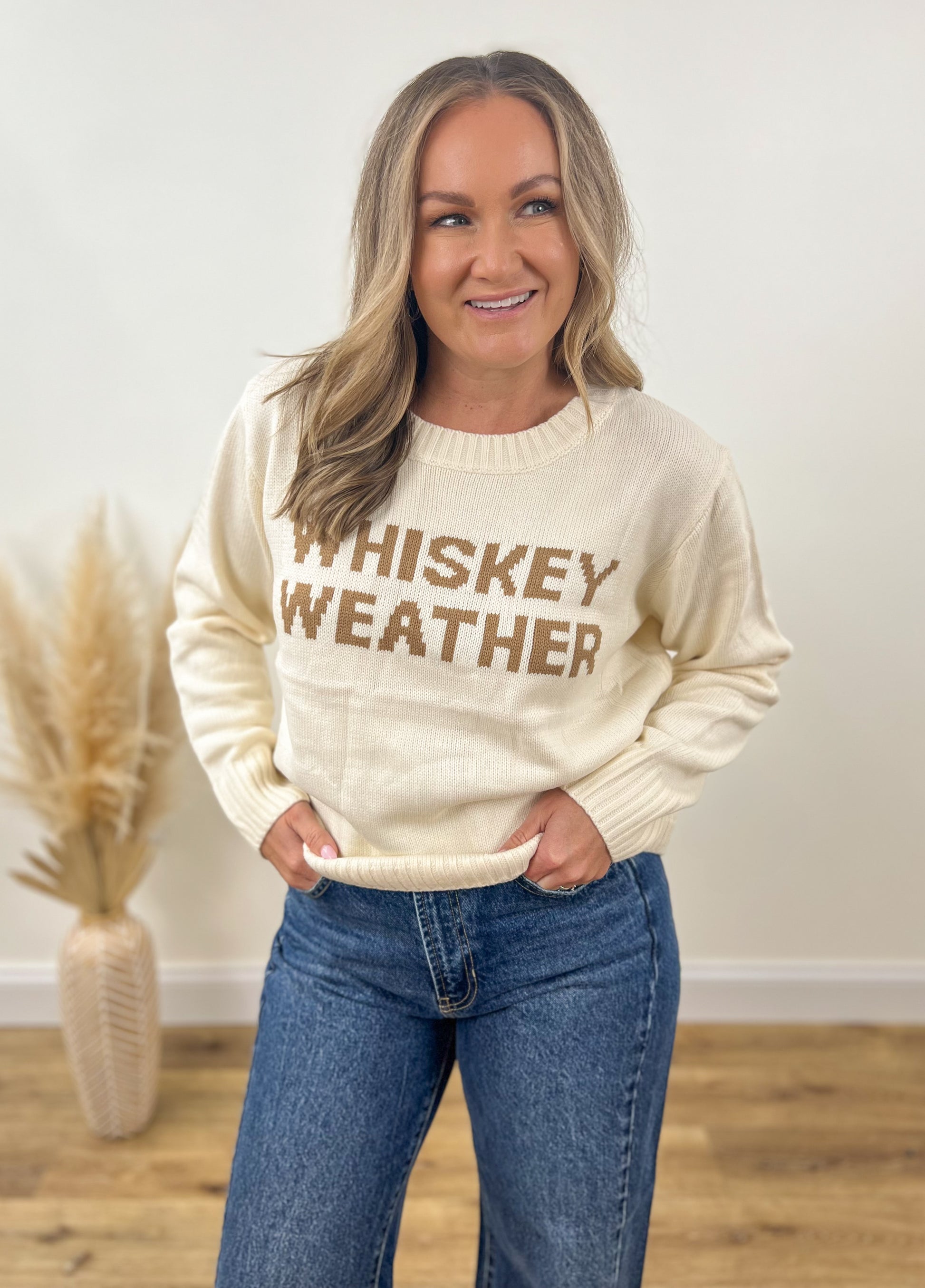 Knit ivory sweater with "Whiskey Weather" detail on chest.