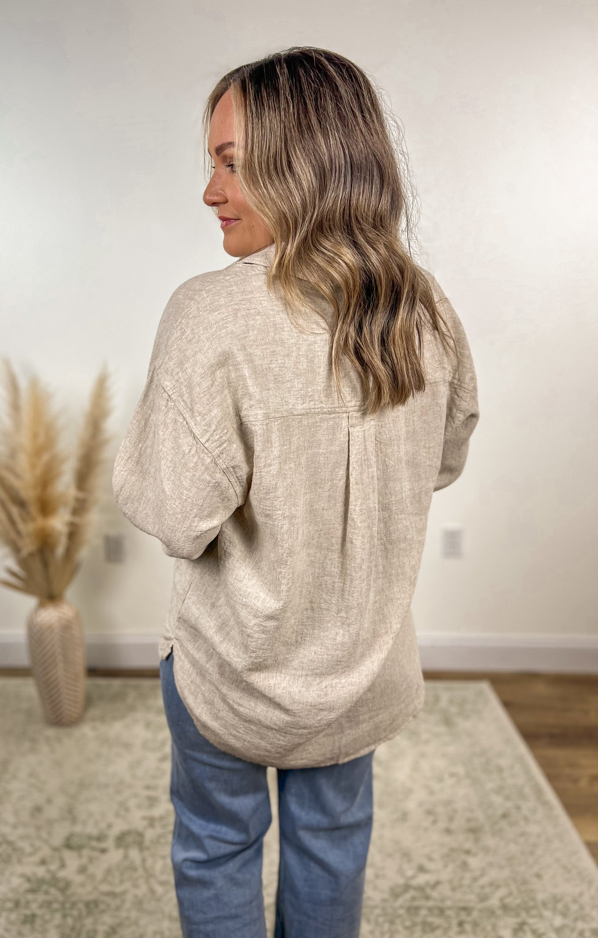 Taupe linen blend button up shirt with collar. A simple classic for year round.